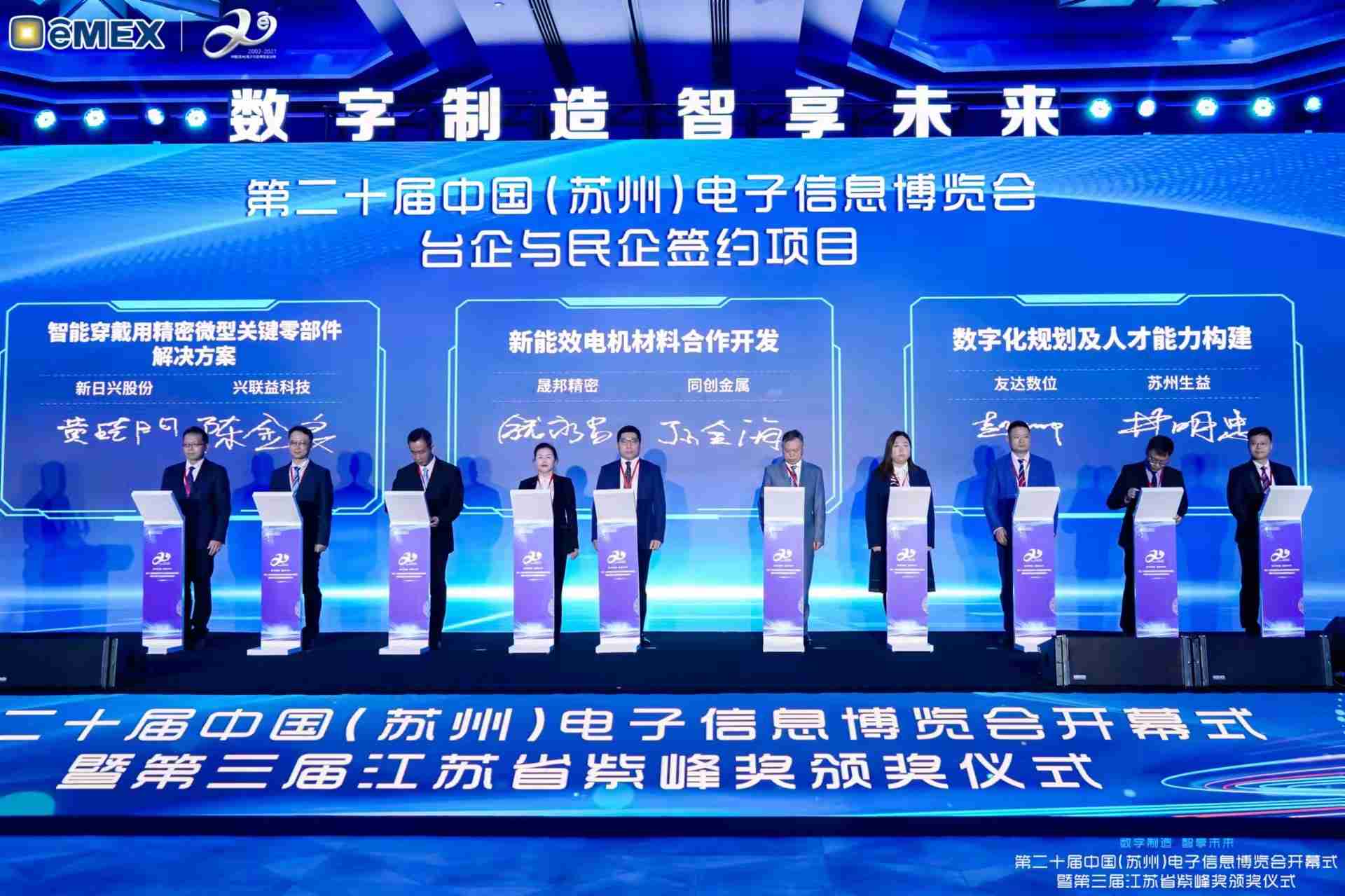 电博会开幕式当天也是第三届江苏省紫峰奖颁奖仪式,,,省台办、、、工信厅、、、商务厅、、苏州市相关领导均出席并颁奖。。。该奖项为表彰对江苏高质量发展做出积极贡献的在苏企业,,由江苏省政府专门设立。。。。菠菜论坛光电 (苏州) 总经理郭振明代表上台领奖,,这也是菠菜论坛苏州连续三次蝉联紫峰奖 出口贸易领军企业奖。。。菠菜论坛数位总经理赵丽娜女士,,,,也参与本次开幕式,,,,上台为本地化赋能签署战略合作协议,,将优质服务资源集合、、、、下沉到更多细分行业,,为更多地区的制造企业提供数字化转型服务。。。。